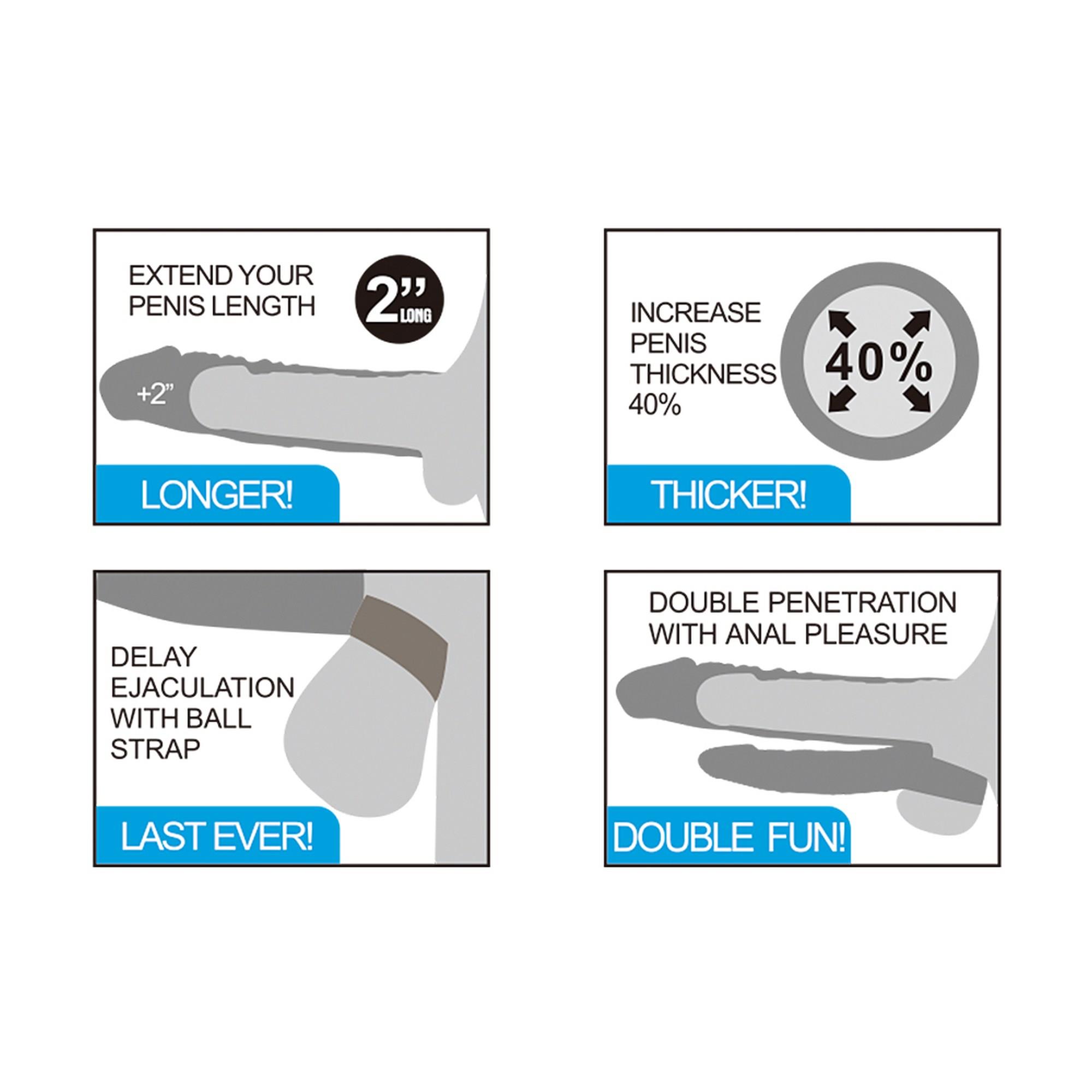 Super-realistyczna przedłużka penisa dla zwiększenia o 2 cale długości i 40% obwodu -Realistyczna główka i żylasty wałek zwiększa doznania dla odbiorcy -Wykonane z materiału reagującego na temperaturę, odczuwalnego w rzeczywistych warunkach Podwójne przedłużenie przyjemności z analnym dildo Długość rękawa: 8 cali Długość wewnętrzna: 6 cali Szerokość rękawa: 1,75 cala Długość dilda: 6 cali Dildo Szerokość: 1 cal