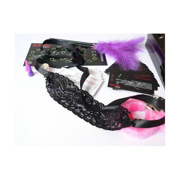 - Opaska oraz karty: przyjemności i rozkoszy (łącznie 42 sztuki kart). Opaską zasłonisz oczy lub skrępujesz partnera/partnerkę. Karty powiedzą Ci jakie ekscytujące zadania dziś przed Wami. Razem sprawią, ze oszalejecie z namiętności!