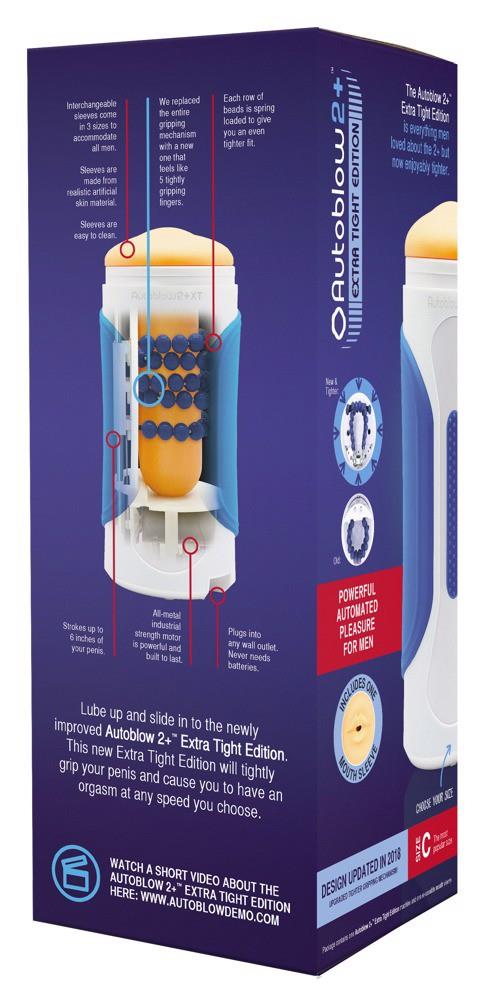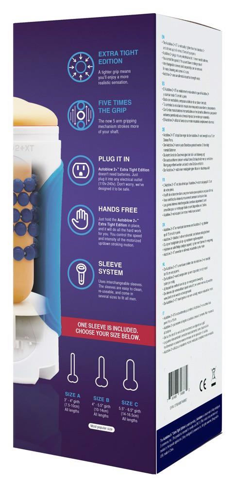 50% ciaśniejszy niż model Autoblow 2+.5 ramion masujących (sprężyn) obraca się wokół wałuBardzo mocny i wytrzymały silnik wysokiej jakościW pełni automatyczny masaż w ruchu w górę i w dółW wytrzymałej obudowie znajduje się silnik, który rytmicznie porusza sprężyny w górę i w dół. Tuleja na penisa jest umieszczana w obudowie tak, że sprężyny znajdują się wokół rękawa. Tuleja z otworem w kształcie ust jest odpowiednia dla WSZYSTKICH długości penisa.Bez ftalanów zgodnie z rozporządzeniem UEUżywać z lubrykantem.Uwaga: Autoblow automatycznie wyłącza się, gdy robi się zbyt gorąco lub jest zbyt duże ciśnienie.