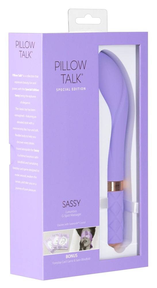 Special Edition: Vibrator Sassy incl. a card game & a satin scarf! The Special Edition Sassy from Pillow Talk is extremely seductive. An exciting couple’s card game with foreplay inspiration and a high-quality satin scarf come with the popular Sassy vibrator. The scarf can be used as a blindfold or as restraints for captivating moments. The stylish vibrator pleasures the vagina intensely with its stimulating raised grooves on the shaft. Its wonderfully curved head can be used to provide spot-on G-spot pleasure. The velvety soft touch surface means that the vibrator slides in almost on its own. The powerful power bullet motor provides deep, shaking vibrations for exciting stimulation. The vibrations can be controlled gradually and precisely at the push of a button. The control button sparkles thanks to its beautiful Swarovski® stone! Other highlights are the Press & Hold function that increases the power, the Quick-Off function that turns it off immediately and the practical travel lock. It can be recharged with the included USB cable. Vibrator: Complete length 20 cm, Ø 3.8 cm. Silicone. Satin scarf: 100% polyester.