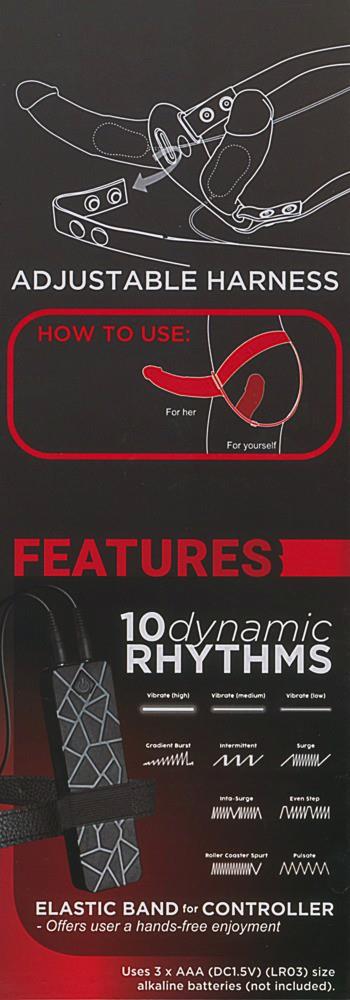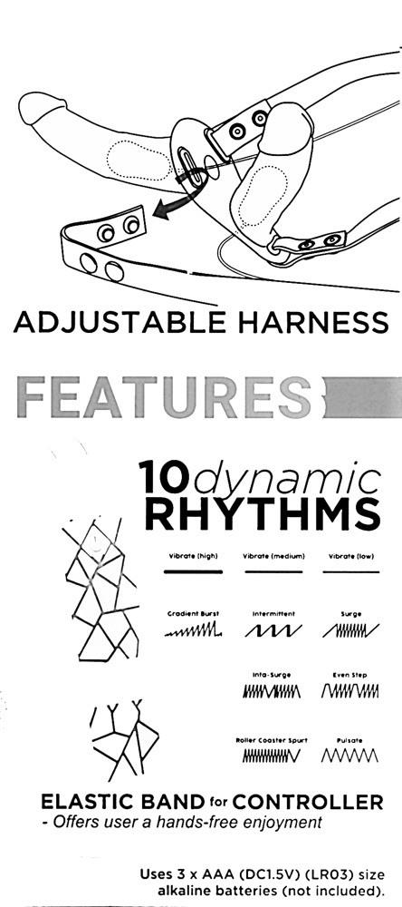 Mały wibrator (długość 9,3 cm, Ø 3,8-4,2 cm) wnika w osobę noszącą uprząż (aktywną).