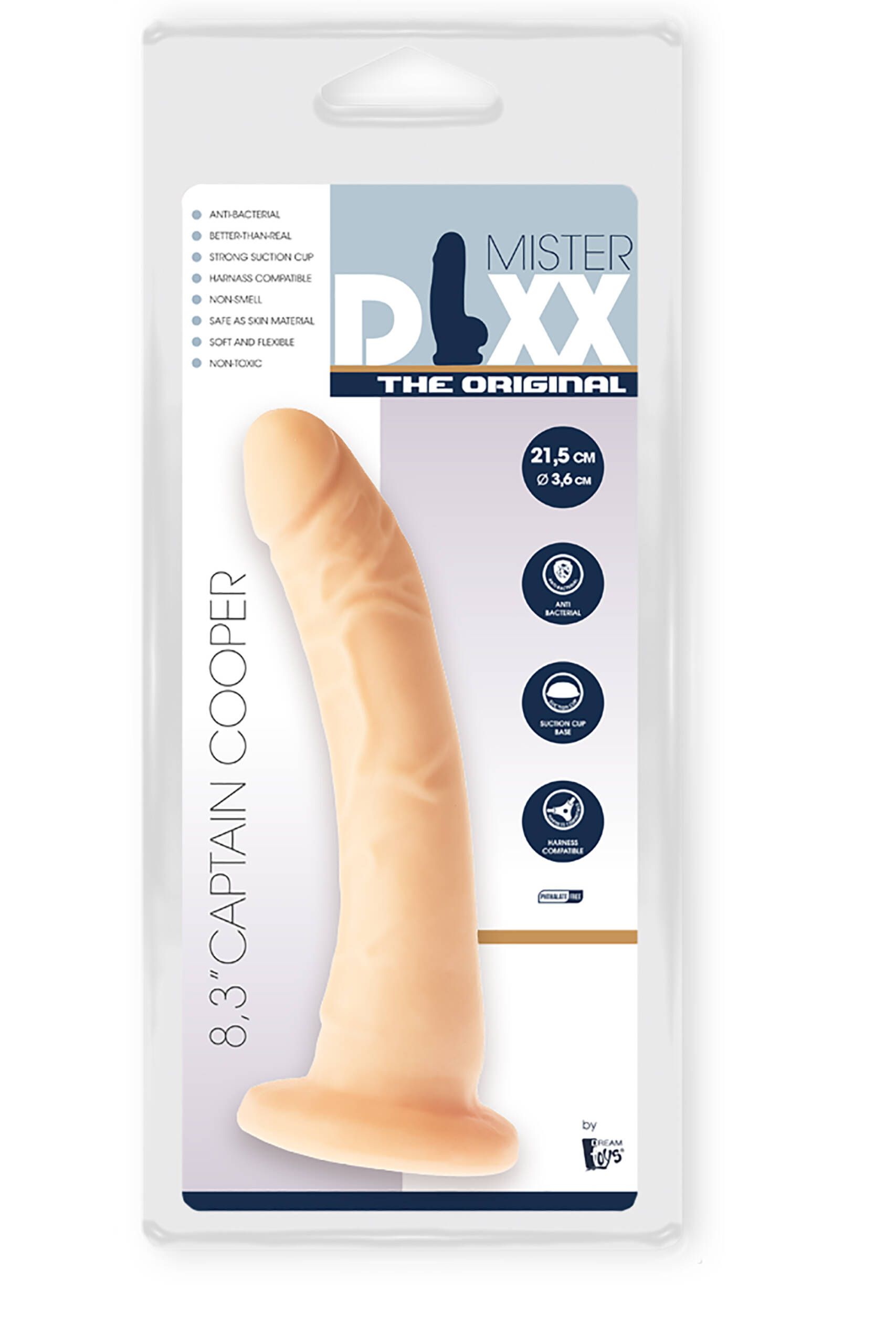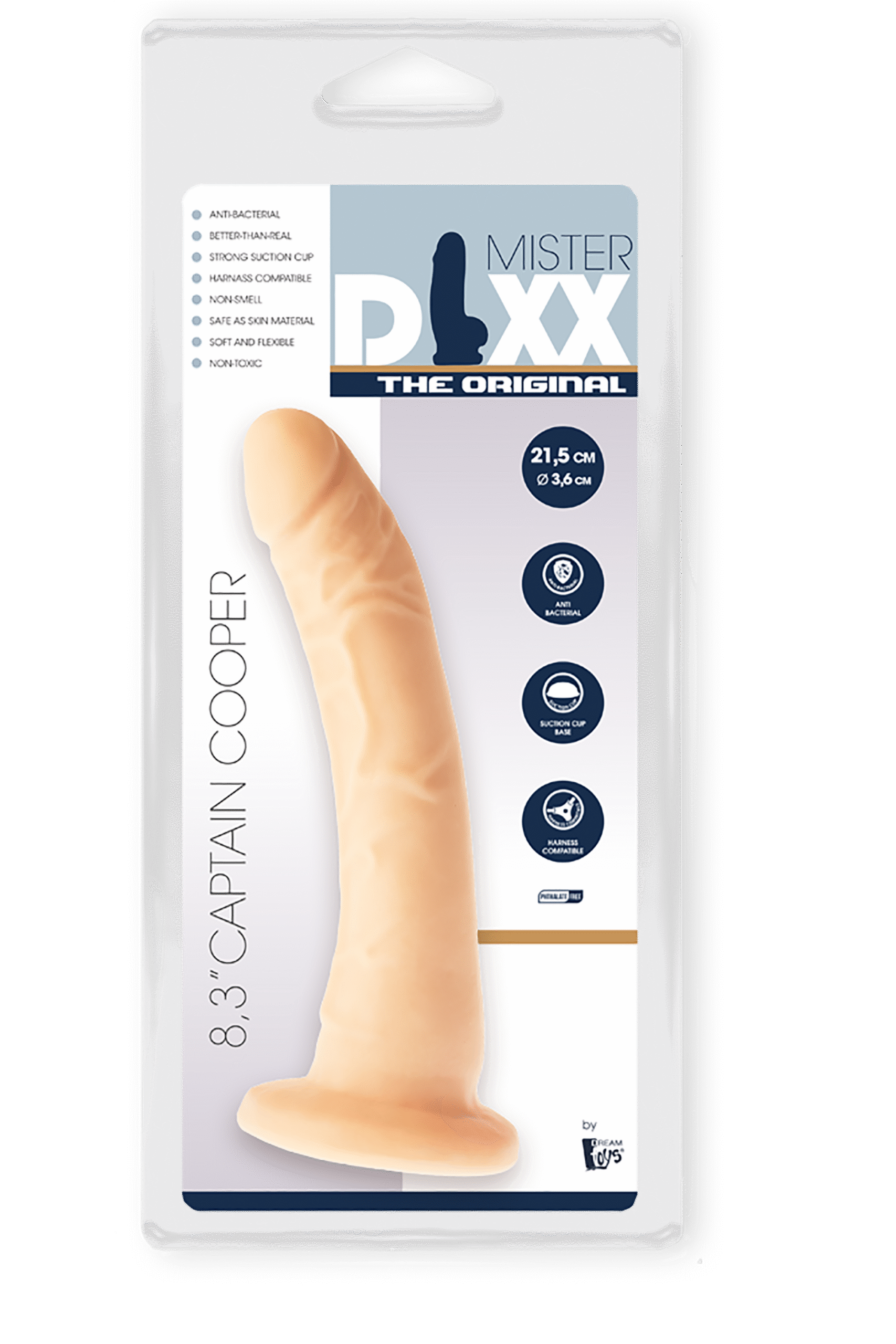 Captain Cooper from the Mr Dixx – The Original collection is a soft and flexible dildo, made of anti-bacterial PVC, non-smelling and body safe.Cooper feels like the real thing and he has a strong suction cup enabling users to enjoy a range of possibilities for all kinds of pleasure, solo or with a partner. The suction cup base makes sure that the captain will stick to any smooth, flat surface, whether it’s the floor, the headboard of the bed or the shower wall. Thanks to the suction cup the dildo can be used in a harness as well, making sure that it stays securely in place when put through the O-ring so the wearer can enjoy this Mr Dixx without any worries. Captain Cooper is one of the taller dildos from the collection. He has a veiny shaft, a modest penis head and he is not too girthy for his length. With his curved shaft Captain Cooper will be able to defy the wet and stimulate the G-spot for intense orgasms! Flexible dildo with a realistic feelStrong suction cupHarness compatible Made of anti-bacterial PVCFree of phthalates and latex, non-smelling, body safeLength 21,5 cmWidth 3,6 cm
