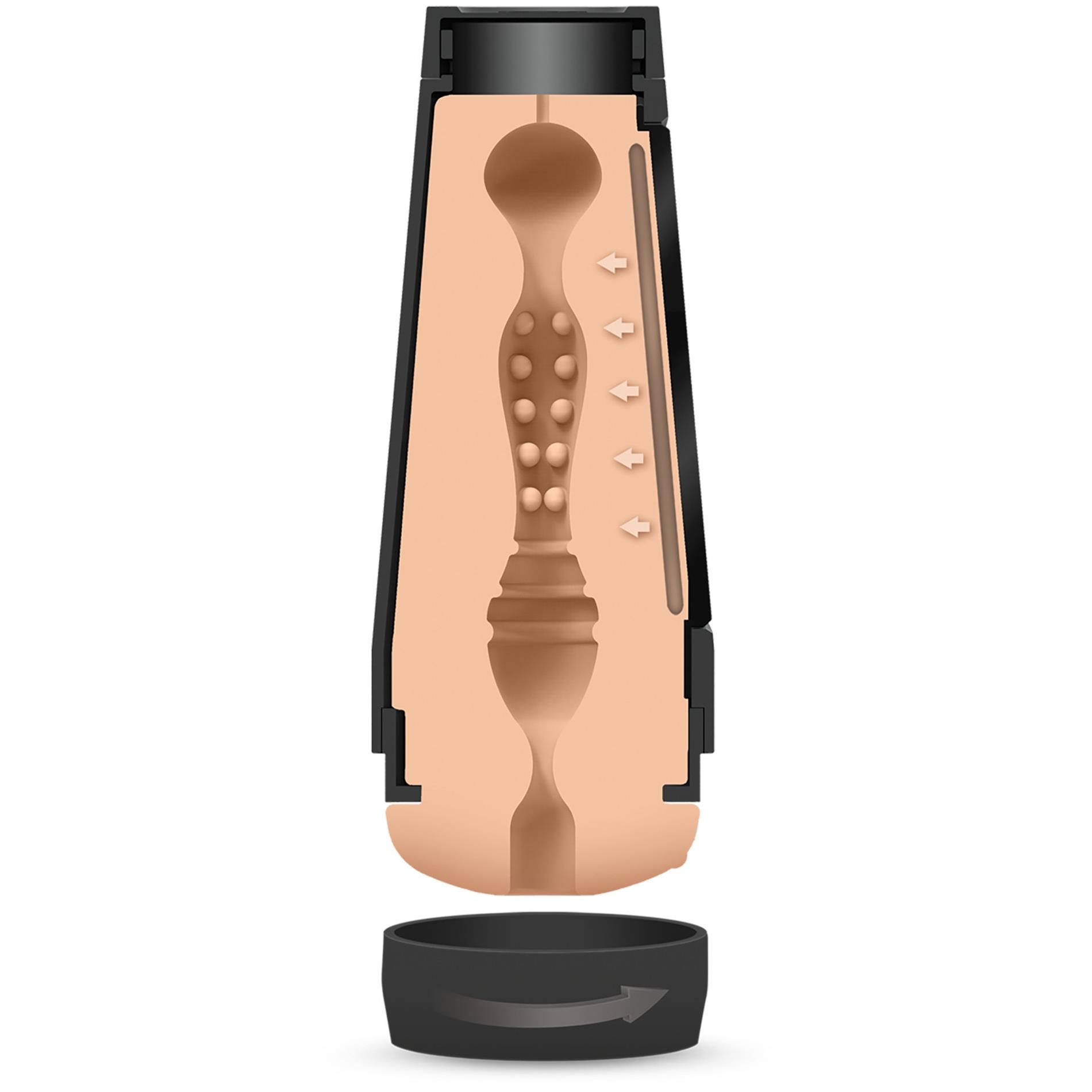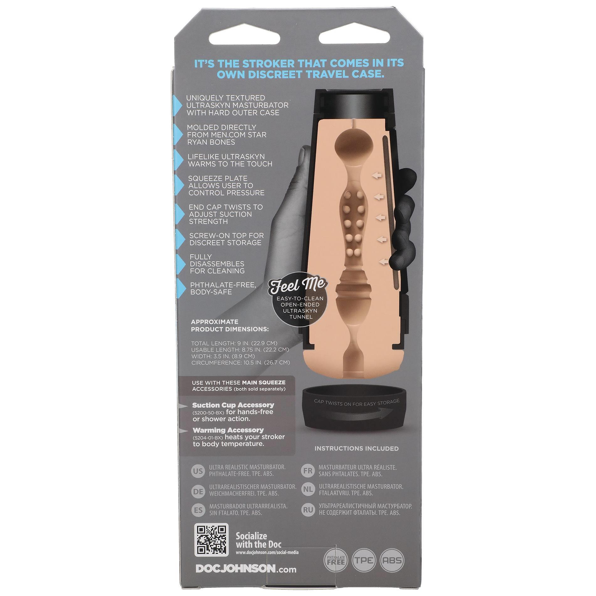 Model Ryan Bones wyposażony jest w regulowaną nakrętkę do kontroli siły ssania oraz ściśnięcie, które pozwala dostosować ciasność każdego ruchu. Ryan posiada realistyczne otwarcie przypominające męskie pośladki, które wyglądają i w dotyku przypominają prawdziwe ciało. Tak jak inne produkty z serii Main Squeeze, Ryan Bones jest wyposażony w unikalną teksturę wewnętrzną, która sprawia, że każde pchnięcie przypomina zanurzenie się w umięśnionym facecie z twoich marzeń.