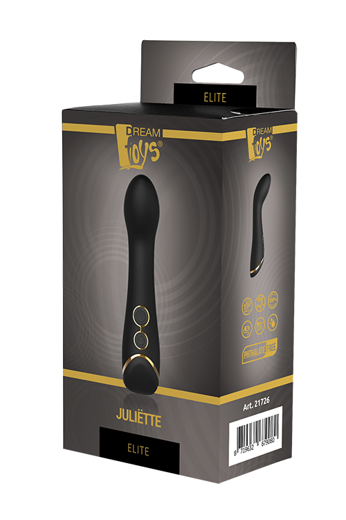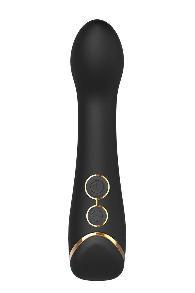 Czarny wibrator ze stylowymi złotymi akcentami i elastyczną, wygiętą końcówką, która jest idealna do stymulacji punktu G.