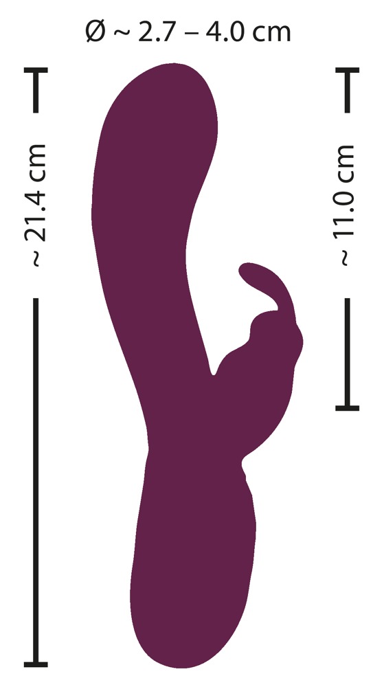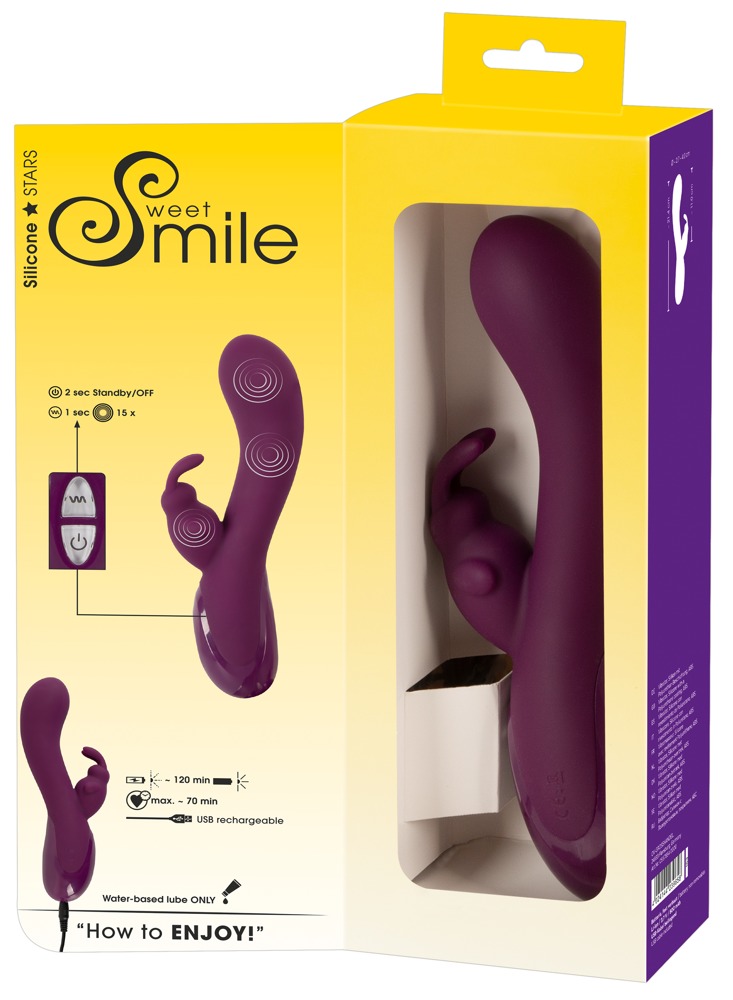 A waterproof powerhouse for all-around pleasure!The Rabbit Vibe from Sweet Smile with its silky-smooth silicone cover will not only impress with its beautiful look and feel, but also with its capabilities. There are 15 vibration modes hidden within the curved shaft and inside the clitoris bunny to simultaneously pleasure vagina, G-spot and clitoris to the fullest.Three motors provide plenty of power for all-around pleasure – one in the shaft, on inside the tip and on in the clitoris bunny. The vibrations can be controlled via a button directly on the toy. The Rabbit Vibe can also be used in the bath or shower, thanks to being waterproof.Rechargeable – USB cable included.Complete length 21.4 cm. Insertion length 11 cm, Ø 2.7 cm – 4 cm. Weight 247 g.Silicone, PU, ABS.