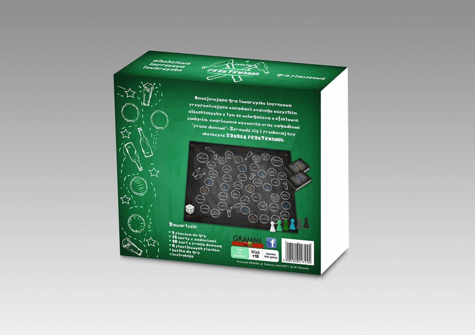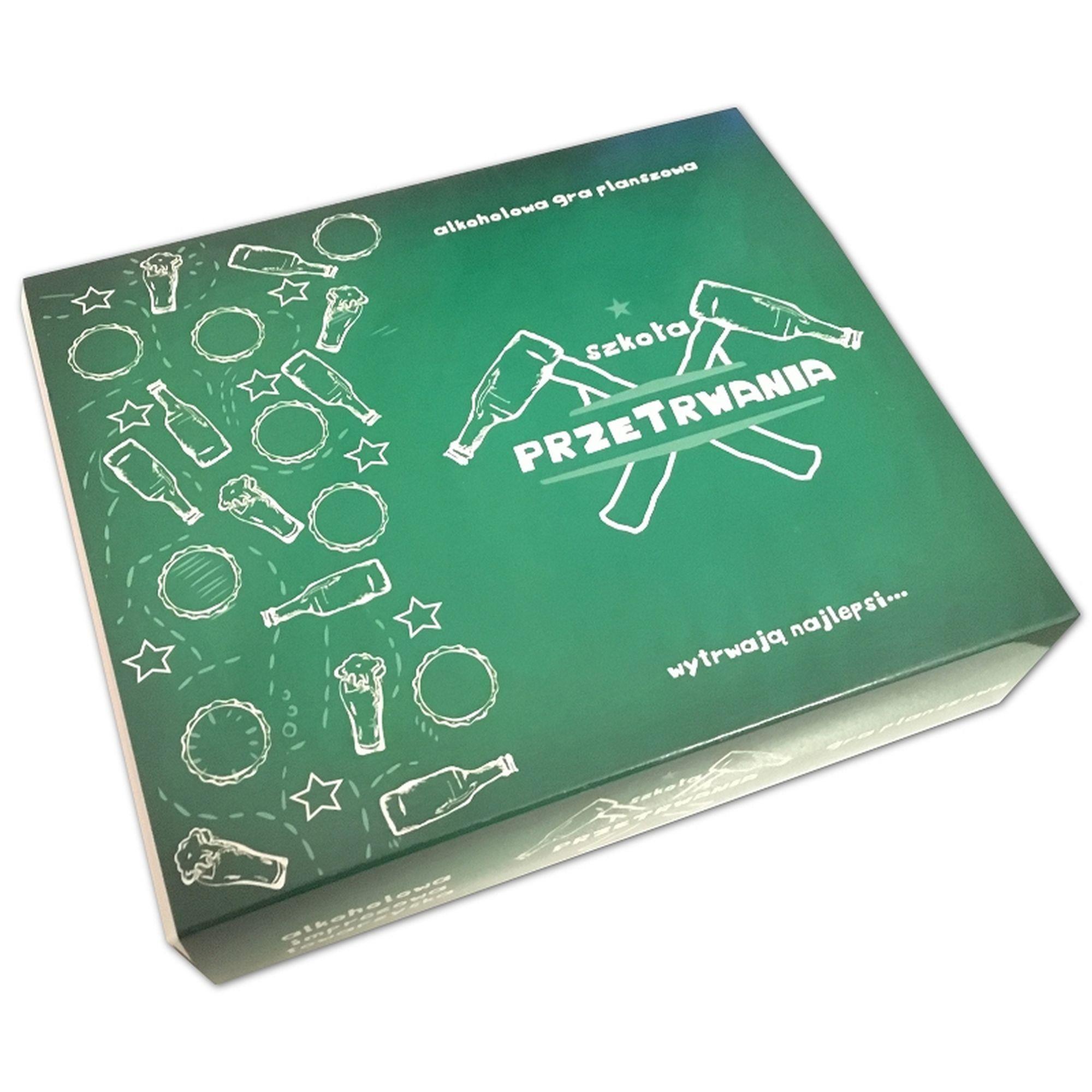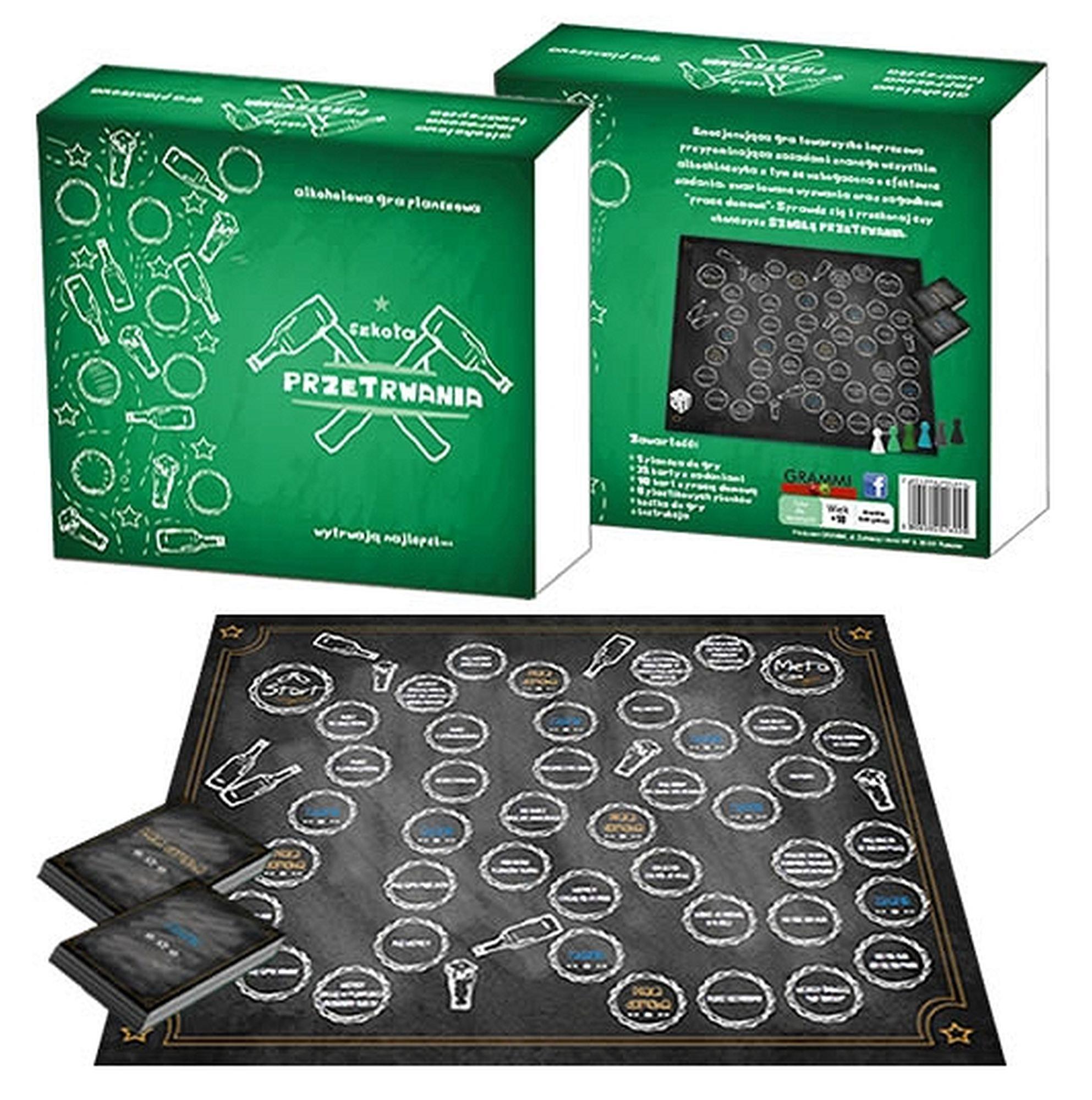Imprezowa gra planszowa- SZKOŁA PRZETRWANIA Zawartość: 1 plansza do gry, 32 karty z zadaniami, 10 kart z pracą domową, 6 plastikowych pionków, kostka do gry, instrukcja.