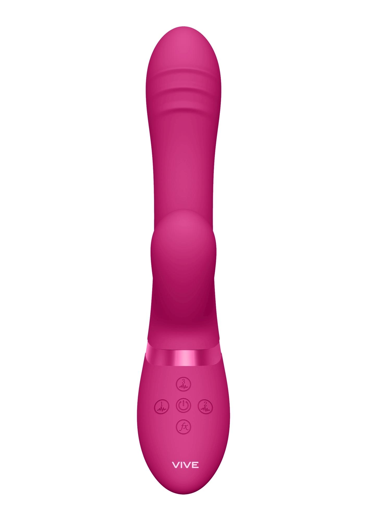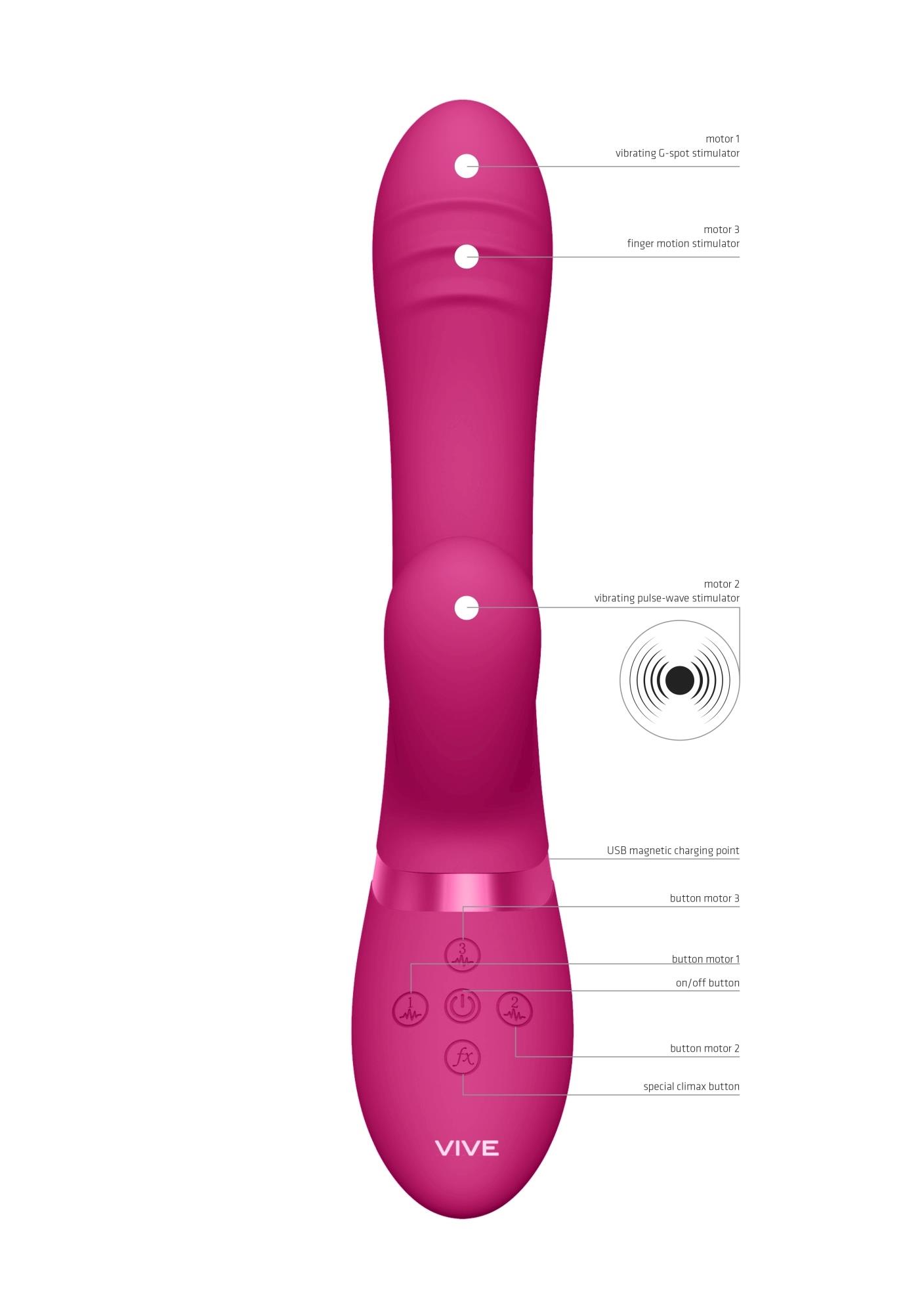 TANI to jeden z najbardziej innowacyjnych i najmocniejszych wibratorów dostępnych dziś na rynku: wykorzystuje trzy nowej generacji silniki F1 oraz zaawansowaną technologię (umożliwiającą niezależne sterowanie wszystkimi trzema z nich).Jeden 10-funkcyjny wibrujący silnik NG F1 do stymulacji punktu G, jeden innowacyjny 10-funkcyjny silnik NG F1 zapewniający ruch naśladujący ruch palca oraz jeden innowacyjny, 10-funcyjny silnik wytwarzający pulsującą falę do stymulacji łechtaczki. Dzięki ich wykorzystaniu ten wibrator oferuje kompleksowe usługi”.Po użyciu tego wibratora poczujesz jak miękną ci kolana, a to dzięki wykorzystaniu 3 wibrujących krawędzi stymulujących punkt G, pulsującej fali, która masuje łechtaczkę oraz ruchowi imitującemu ruch palca , co przekłada się na aż 1000 różnych ustawień.Zabawkę wykonano w 100% z gładkiego silikonu medycznego (który jest zarazem hipoalergiczny), jest całkowicie wodoodporna (IPX7) i niesamowicie cicha (poniżej 60 dB).Tym samym możesz jej używać, gdy tylko przyjdzie ci na to ochota!Wibrator wyposażono w akumulator litowo-jonowy ładowany z użyciem magnetycznego kabla USB.Po całkowitym naładowaniu kablem USB zabawka zapewnia 40 minut niezapomnianych zabaw.Po prostu podłącz, naładuj i baw się w najlepsze!A gdy już będziesz blisko, za jednym dotknięciem przycisku z funkcją szczytowania natychmiastowo nastawisz wszystkie silniczki na pełną moc i prędkość i, co najważniejsze, doprowadzisz się do orgazmu, który zwala z nóg.Wszystkie wibratory VIVE mają roczną gwarancję, by chronić twoją inwestycję.Wymiary opakowanie 10,70 x 7,80 x 24,20 cmWaga opakowanie 255 gramWymiary produktu 21,5 x 4,3 cmMasa produktu 255 gramWprowadzana długość 11 cmLiczba silników 3Tryby prędkości 10Wiele prędkości TakPoziom głośności 60 dBZ akumulatorem TakCzas ładowania 180 minCzas pracy naładowanej baterii 40 minWodoodporność TakOdporność na zachlapania TakBez ftalanów TakMateriały ABS, Silicone