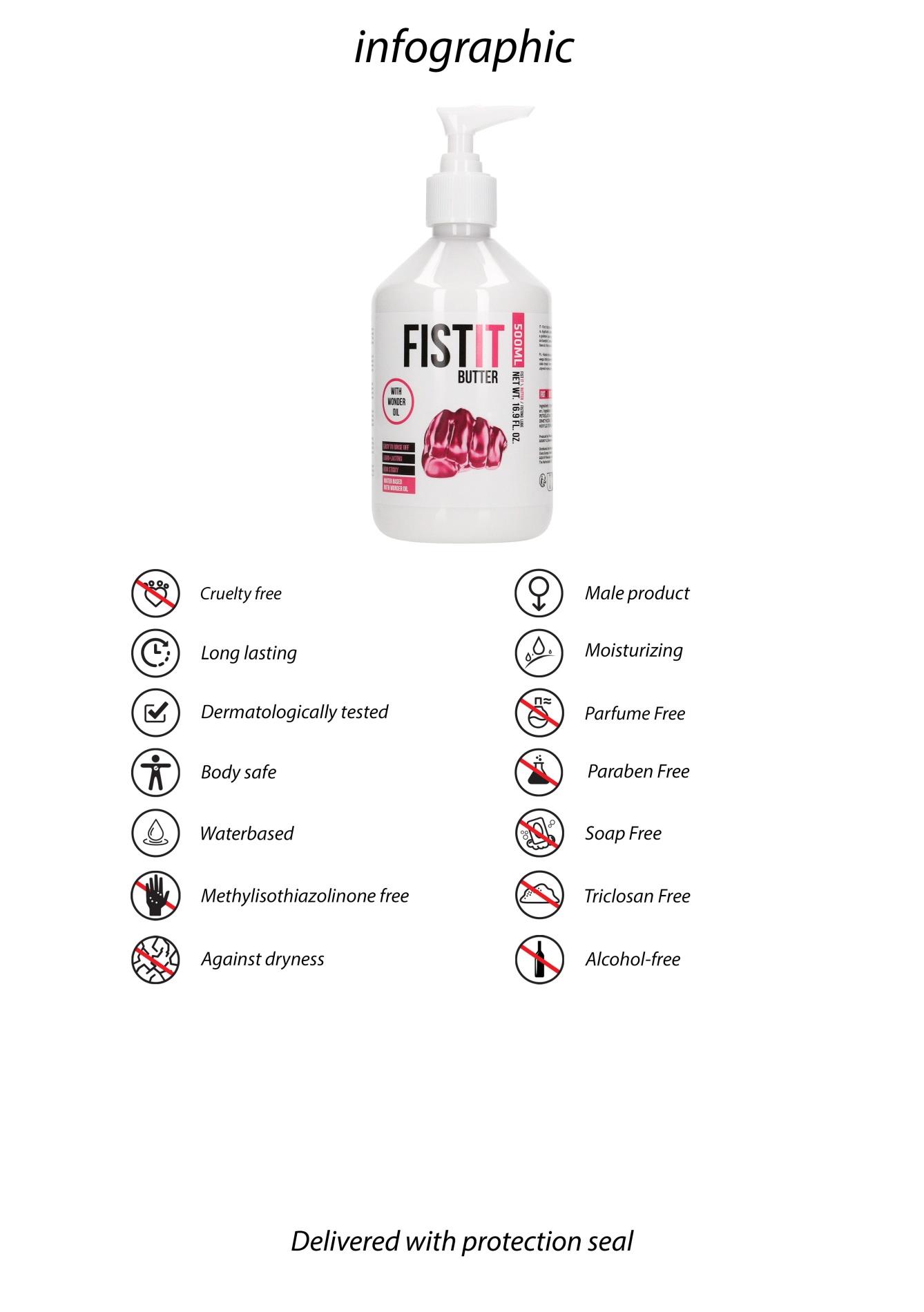 Fist It Butter to lubrykant na bazie wody z dodatkiem cudownego olejku, który zapewnia długotrwały efekt. Nałóż dowolną ilość lubrykantu na dowolną część ciała i ciesz się tym doświadczeniem! Przechowywać poza zasięgiem dzieci. Przechowywać w chłodnym, ciemnym miejscu.