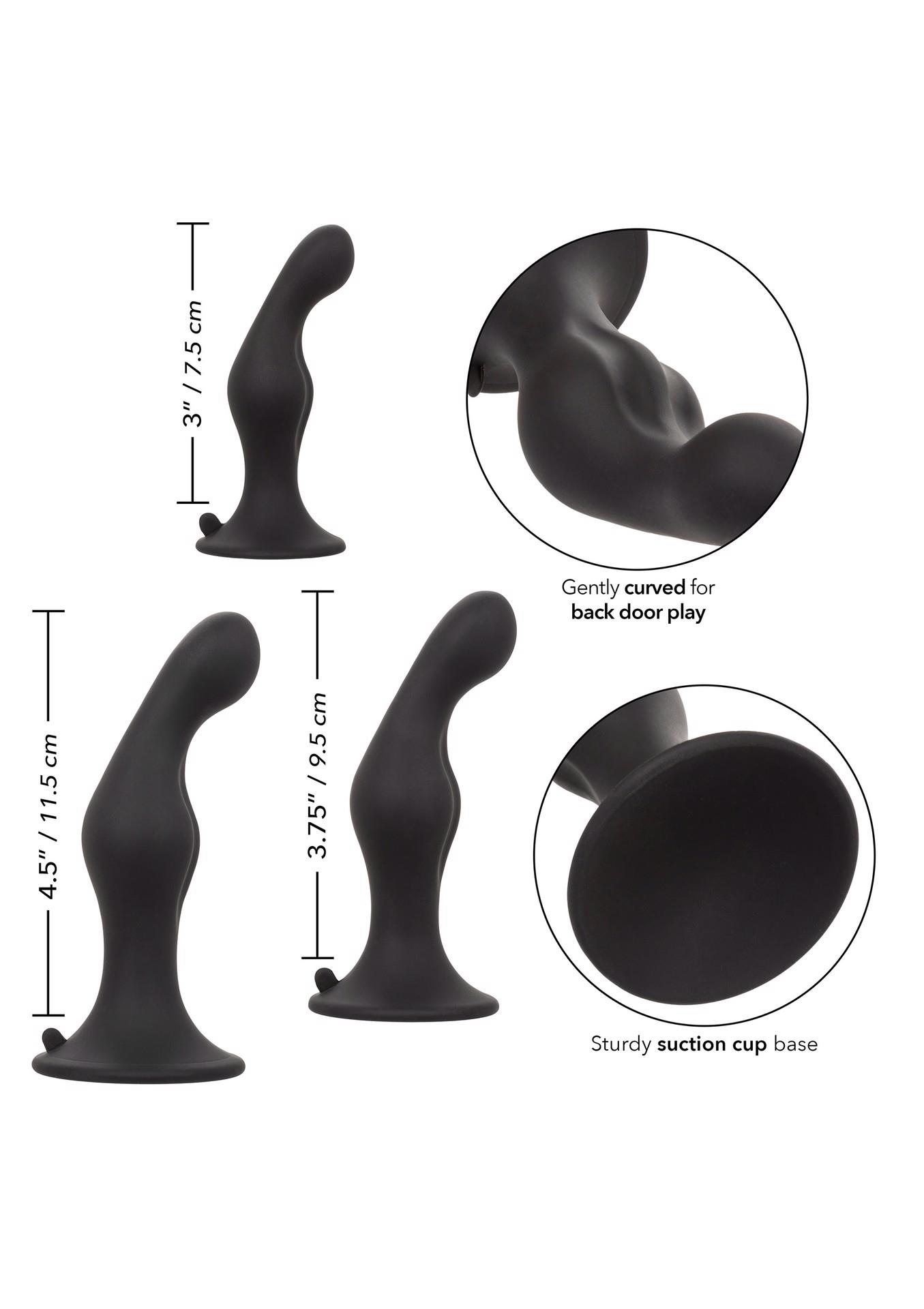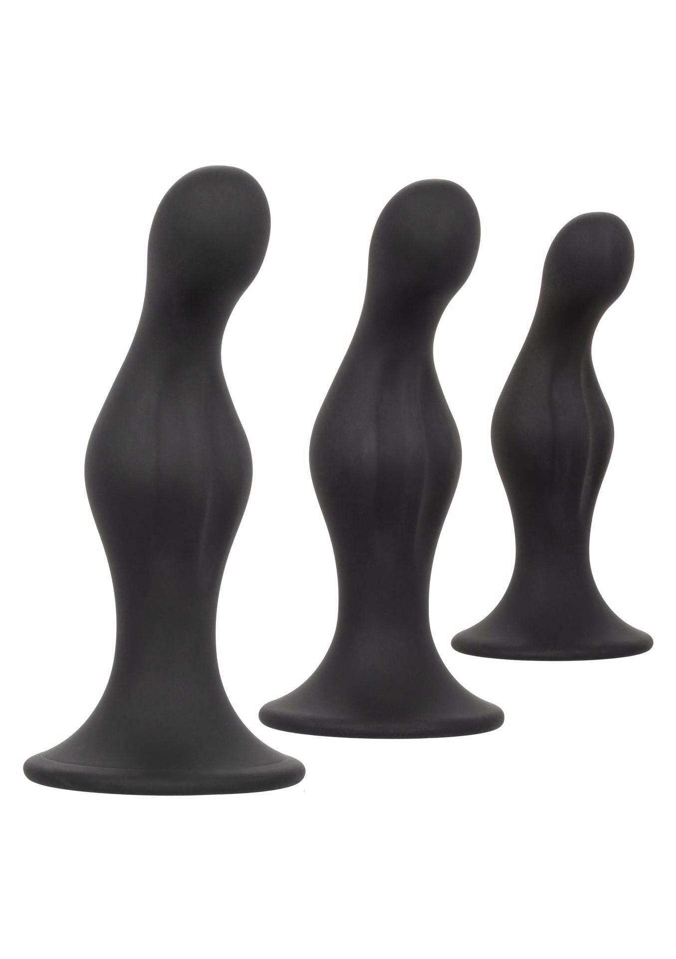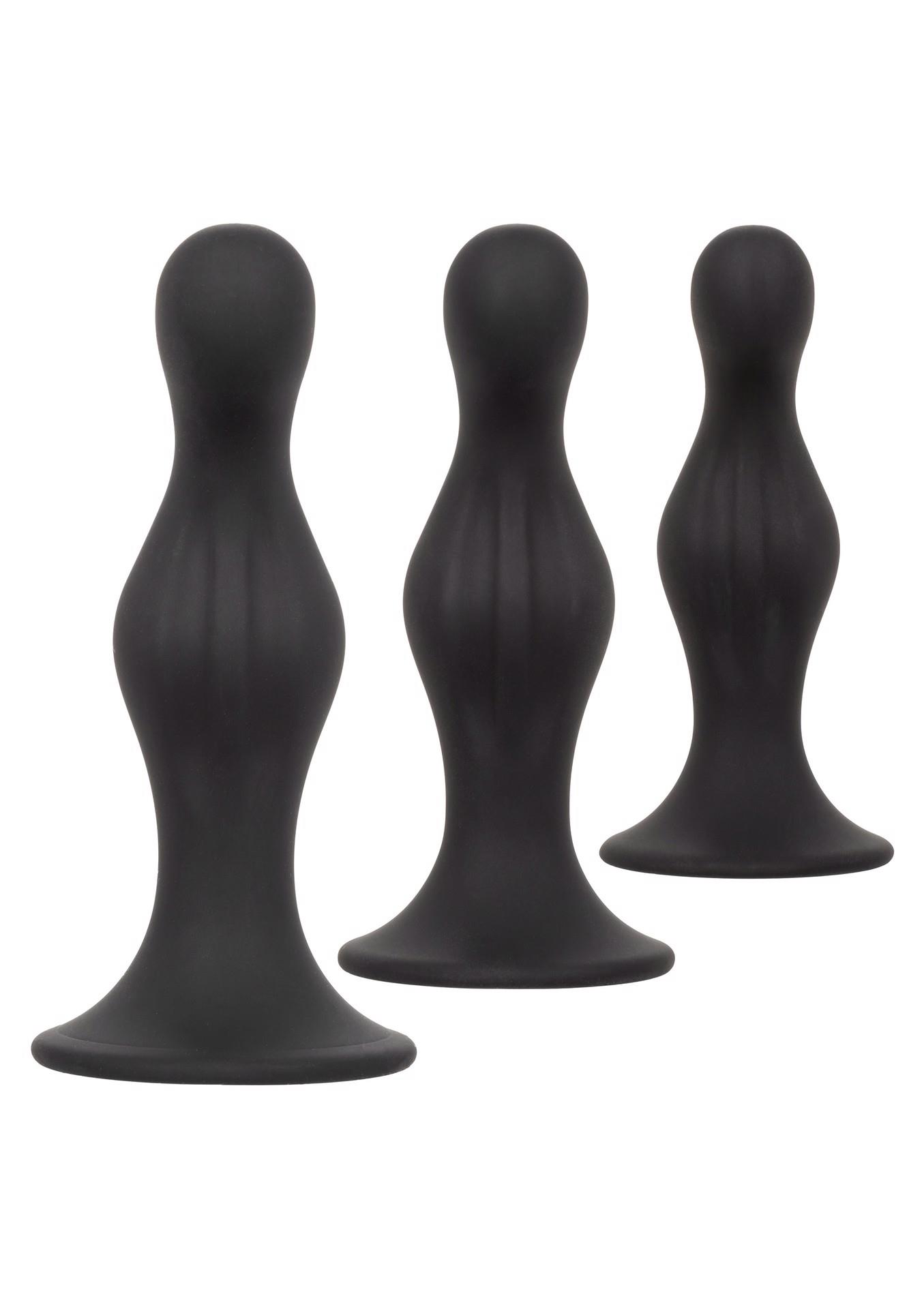 Rozkoszuj się drżeniem kolan dzięki zestawowi 3 stopniowanych rozmiarów delikatnie zakrzywionych zatyczek analnych z podstawami przyssawek.